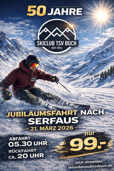 Der Skiclub TSV Buch wird 50! Das feiern wir und fahren zusammen nach Serfaus zum Skifahren und gemeinsamen Apres Ski.